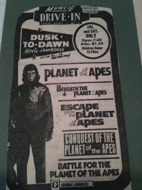 Above you’ll find an ad for a Muncie Drive-In dusk-to-dawn screening of the original Planet of the Apes movie series. This screening took place sometime after May 1973 when “Battle for the Planet of the Apes,” the last entry in the series, had been released.