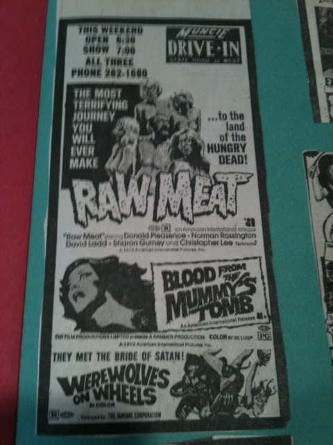 Here’s a Muncie Drive-In ad for a trio of grisly horror movies toplined by “Raw Meat,” a 1973 film. I’m not sure I went to see these. Two of the three were R-rated and I would have been 13 at the time.