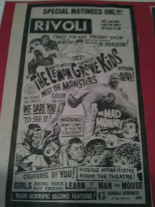 A year later, the same director, Ray Dennis Steckler, made “The Lemon Grove Kids Meet the Monsters,” a horror movie spoof. As you can see from this ad, Muncie’s Rivoli theater screened this classic. I was there.