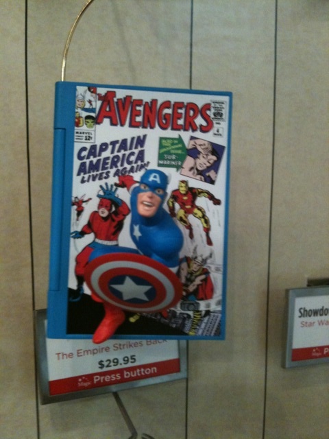 Now this is more like it: A Hallmark ornament depicting the cover of “Avengers” issue number 4, with Captain America leaping out in three dimensions.