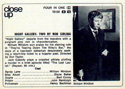 “They’re Tearing Down Tim Riley’s Bar,” from 1971, was written by Serling and comes across as more of a “Mad Men” story of corporate desperation than a spook story with William Windom as a business executive who’s been left behind in the rat race and longs for a past that lives on only in a shuttered neighborhood bar.