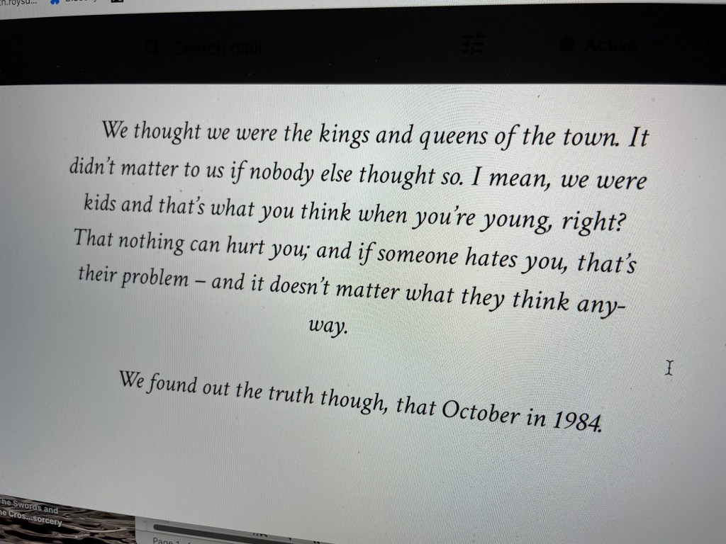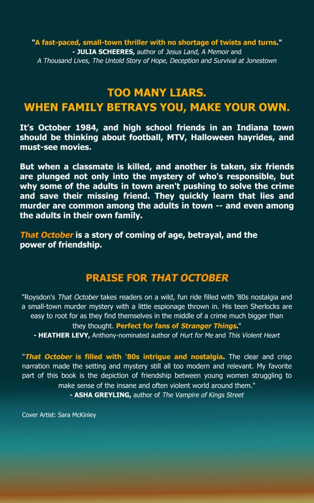 My novel THAT OCTOBER is a 1984-set YA crime book about high school friends who band together to investigate when a friend is killed and another is taken. They find that the adults in their Indiana town seem strangely slow to act to solve the mystery and bring their friend home.