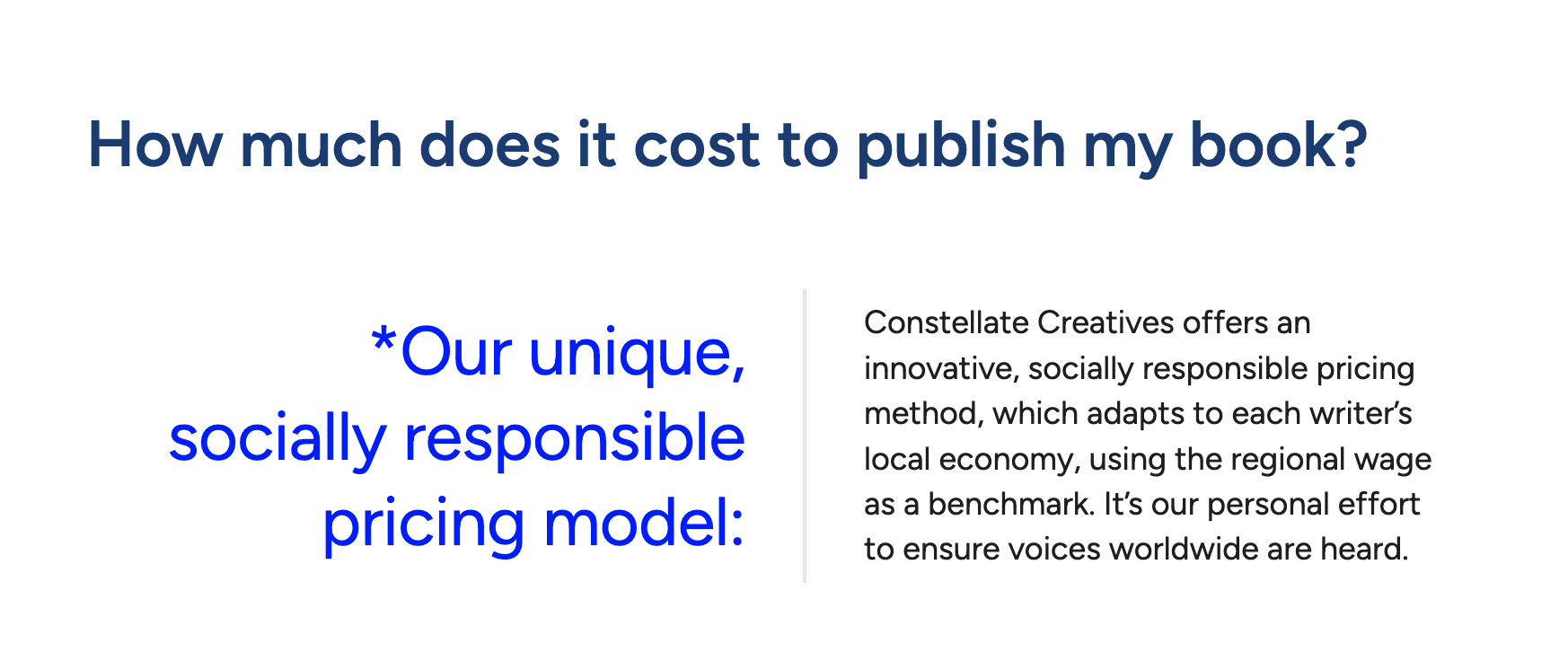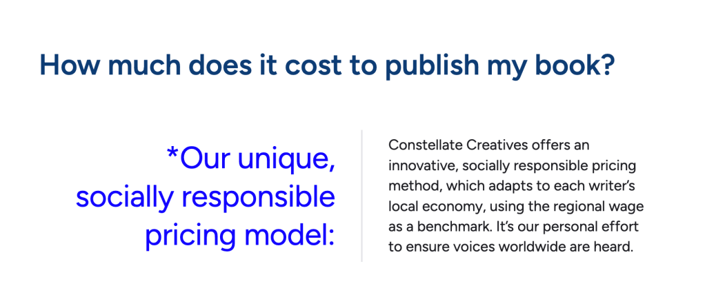 And note the slide I’ve posted above: Constellate Creatives is offering editing, publishing and marketing services, or some combination of those, and at socially-responsible fees based on the regional wage in each writer’s local economy.