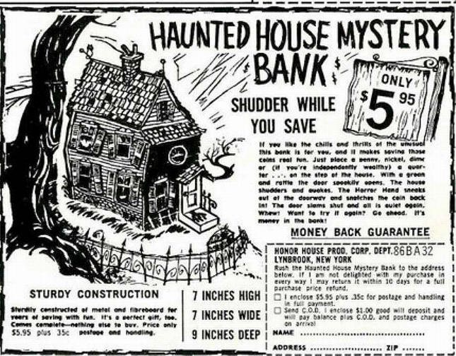 That price, by the way, separated a lot of us out of the possibility of buying this bank. How many kids in the 1960s had six bucks for something from a comic book ad? How many kids had parents who would let their kid send off six bucks?