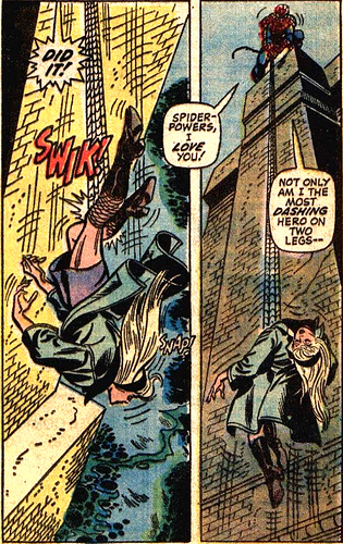 Spidey the smart-ass. Here’s one thing that works really well. In the comics, Spidey is a jokester. He quips and hurls insults about as often as he spins webs. The movie does a good job with this aspect of Peter’s personality.