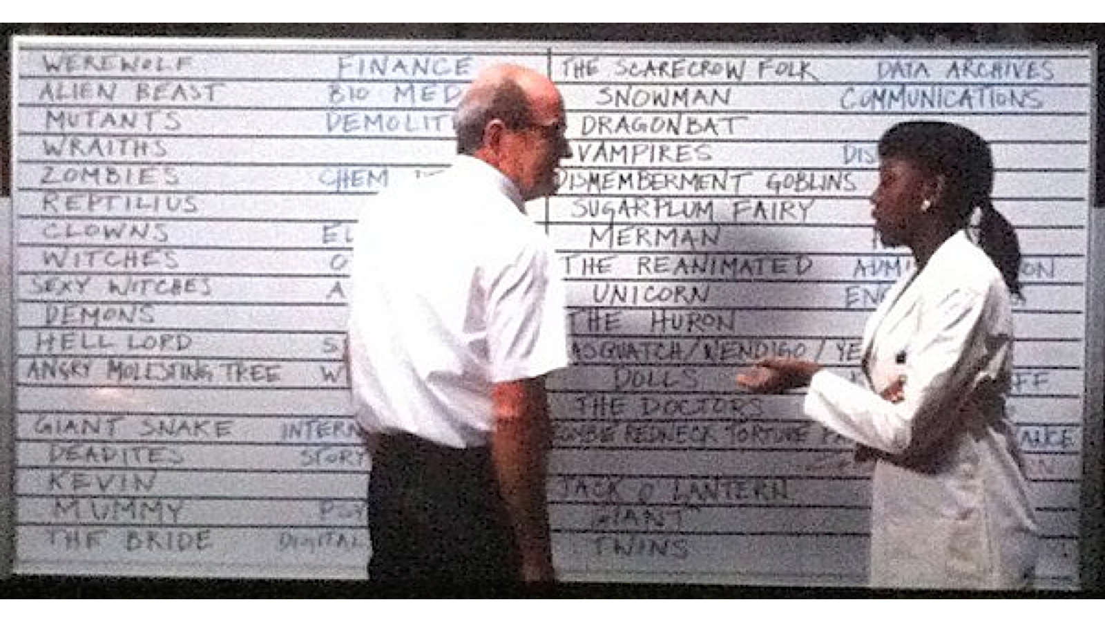 If you’ve seen the movie, you know the lab geeks running the horror show from behind the scenes have a whiteboard listing all the monsters possible in various scenarios at the cabin. “Giant snake,” “Deadites,” “Hell Lord” and — best of all — “Kevin” are among the choices.