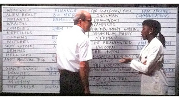 I hope someone’s working on a detailed analysis of the whiteboard in the war room that contained all the monsters and scenarios. I tried to read as much of it as I could and caught some of the other threats like “Kevin” — a Jason stand-in, possibly? — but I would love to see everything that was up there.