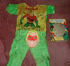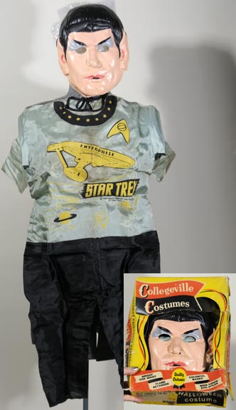 I don’t remember what my costume was this particular year. But it was  a typical 1960s-era costume like those made by Ben Cooper or Collegeville: A hard plastic mask, secured to my head with an elastic band, and a cheap plastic tunic. If it was an Aquaman or Spock or any number of other similar costumes, the tunic, as you can see from the photos here, was anything but subtle. Instead of being an accurate recreation of the character’s costume from comic books or TV, it was emblazoned with the character’s name in big, dorky letters.