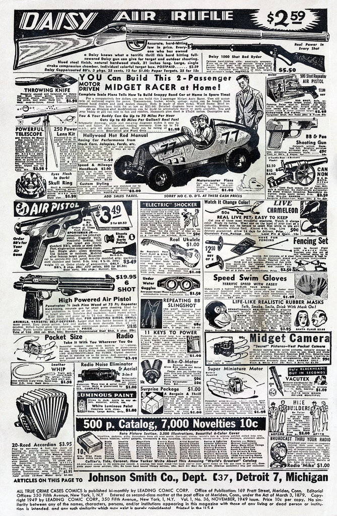These ads were usually for magic tricks, although a 1953 issue of Popular Mechanics found the Magic Center – still located at 741 Eighth Avenue in NYC – offering a “terrifying” ape man mask.