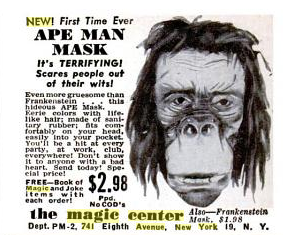 These ads were usually for magic tricks, although a 1953 issue of Popular Mechanics found the Magic Center – still located at 741 Eighth Avenue in NYC – offering a “terrifying” ape man mask.