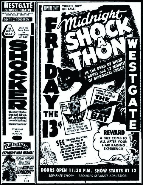 This “midnight shock-a-thon” ad features not only “The Mask” but “The Bat,” probably a 1959 Vincent Price thriller and “Town Without Pity,” a 1961 Kirk Douglas movie that is sold, as you can tell from the ad, in the sleaziest way possible: