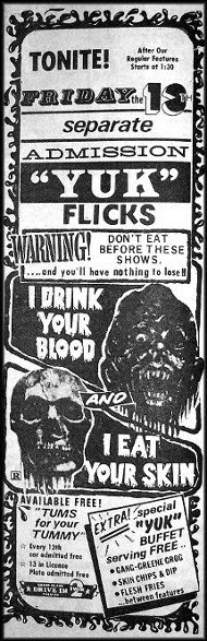 Lastly, how about the exploitation double-feature classic “I Drink Your Blood” and “I Eat Your Skin.” The former is a 1970 movie about Satanists terrorizing a town. The latter originally came out in 1964 and was about zombies. The combination of titles was drive-in movie gold.